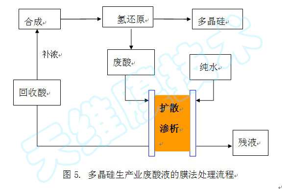 多晶硅是制造單晶硅、太陽(yáng)能電池及高純硅制品的主要原料。在多晶硅的生產(chǎn)中會(huì)產(chǎn)生大量的廢酸。用擴(kuò)散滲析法回收該廢酸再返回系統(tǒng)使用,這樣既為企業(yè)節(jié)約了資源,又解決了環(huán)境污染問(wèn)題。 |