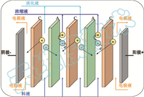 | 利用離子交換膜在電位差推動力的作用下,從水溶液中脫除離子的一種分離技術。如圖所示,當氯化鈉水溶液流過兩膜間的隔室時,在電場作用下,溶液中帶正電荷的鈉離子做定向連續遷移,滲透通過帶負電荷的陽離子交換膜,被陰離子交換膜阻擋;與此同時,溶液中帶負電賀的氯例子連續滲透通過陰離子交換膜。這種反離子的定向遷移結果是每隔一室溶液中的離子濃度增加,而與其相見的另一隔室內的溶液中離子濃度下降。